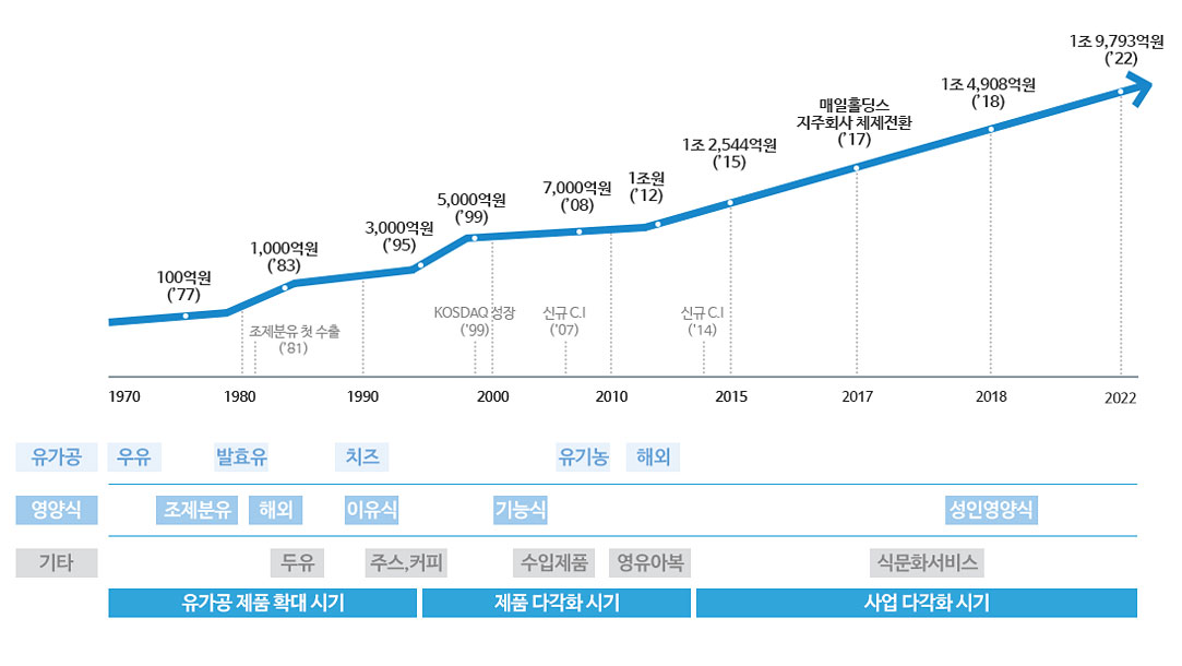 여기, 대한민국의 낙농업을 선도하며 당당히 글로벌 기업으로 성장한 종합식품회사가 있습니다 남들이 가지 않은 길을 걸으며 매일 매일 최초에 도전해 온 그 이야기에 귀 기울여 보십시오 1969년 유제품 전문회사로 출발하여 한국 최초, 최초, 최초… 매일유업이 써 내려간 최초의 이야기들은 대한민국 유제품의 역사가 되었습니다 우리는 소비자에게 사랑 받기 위해 늘 신선하고 믿을 수 있는 우유를 만듭니다 한국 최초 HACCP인증을 획득한 유아식. 전통적 기술로 만든 발효유 프리미엄 우유시장의 새 지평을 연 상하목장, 카페라떼, 썬업을 비롯하여 단 한 명의 아이도 건강한 삶에서 소외되지 않도록 한국 최초 15종의 특수분유 개발에 이르기까지 매일 매일 새로운 이야기를 건네고 있습니다 우리가 매일 추구하는 목표는 세계수준의 기술과 첨단 시스템으로 만든 최고품질의 제품을 생산지에서 소비자의 손까지 안전하고 신속하게 전해드리는 것입니다